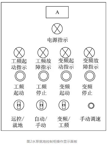 清凈水泵就地控制柜操作顯示面板如圖2所示。水泵工頻運行時“工頻起動指示燈”點亮,工頻故障時“工頻故障指示燈”點亮;水泵變頻運行時“變頻起動指示燈”點亮,變頻故障時“變頻故障指示燈”點亮。